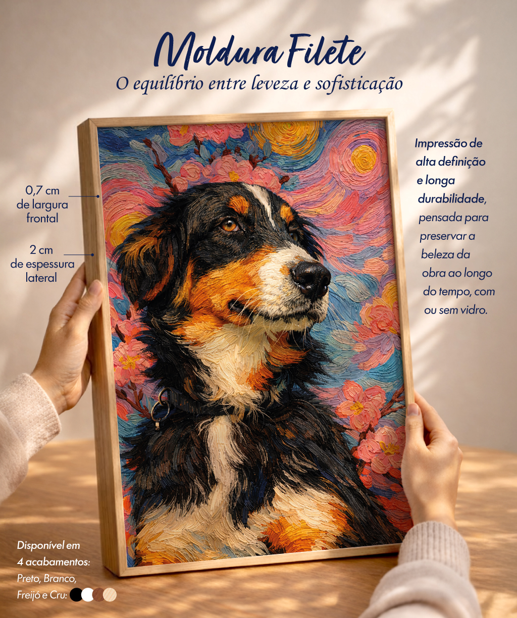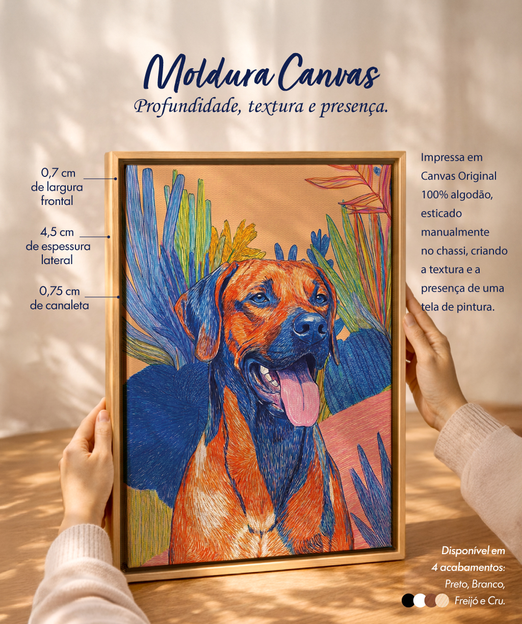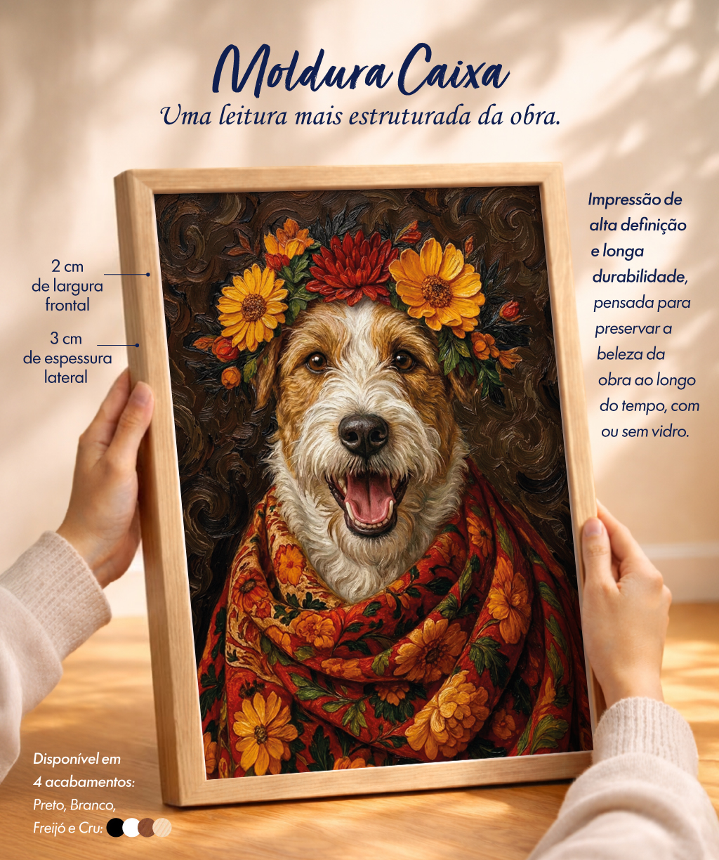 Com estrutura mais robusta, esse acabamento traz profundidade e destaque à obra. A moldura cria uma leitura mais elegante e sofisticada, sendo ideal para ambientes que pedem um quadro com maior presença visual.